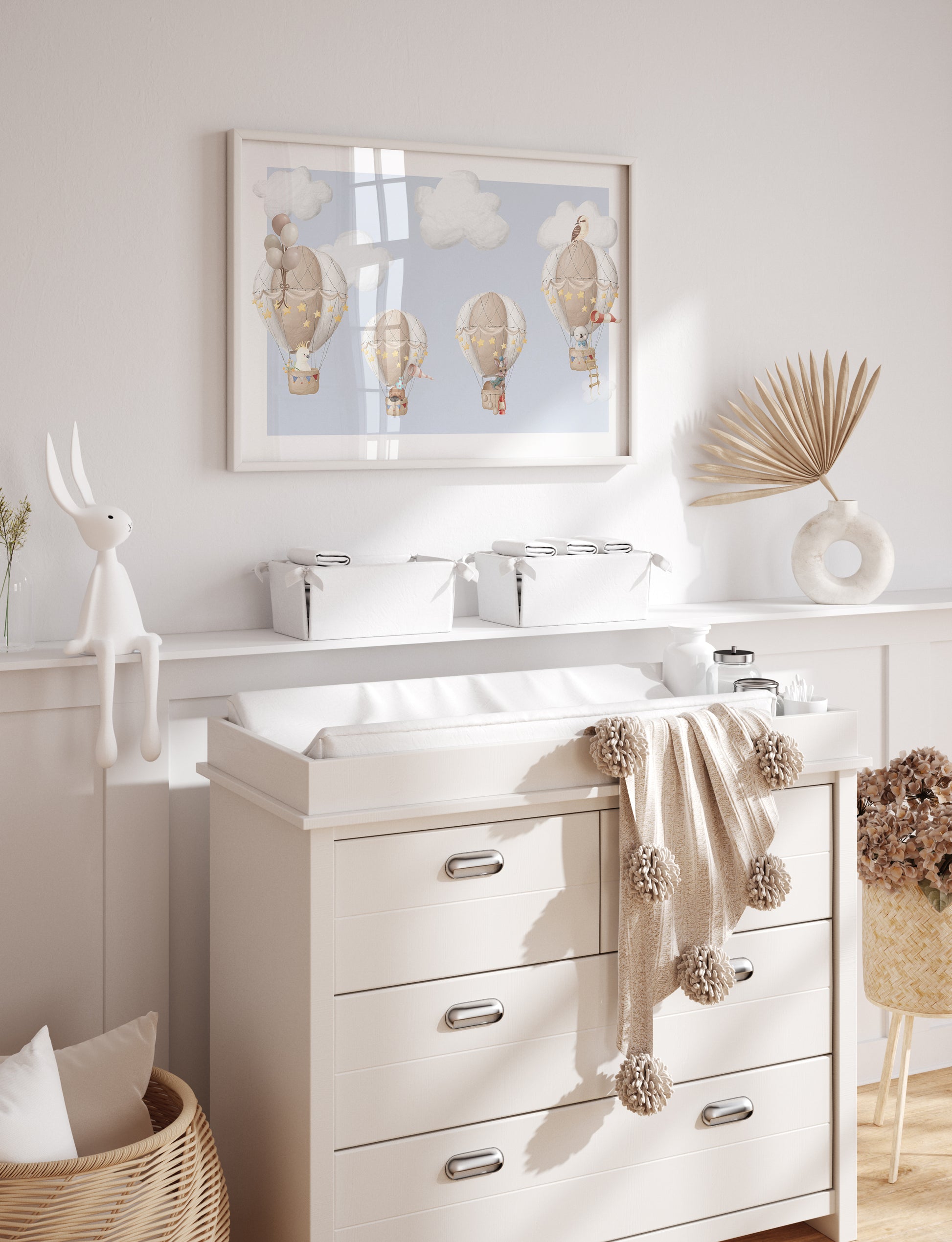 Australian animal themed and with a beautiful neutral colour palette, this art print makes for a beautiful addition to the nursery or children’s room. Featuring an adorable koala, kangaroo, platypus, cockatoo and kookaburra, dress with adorable accessories to make this print fun, detailed and home grown.